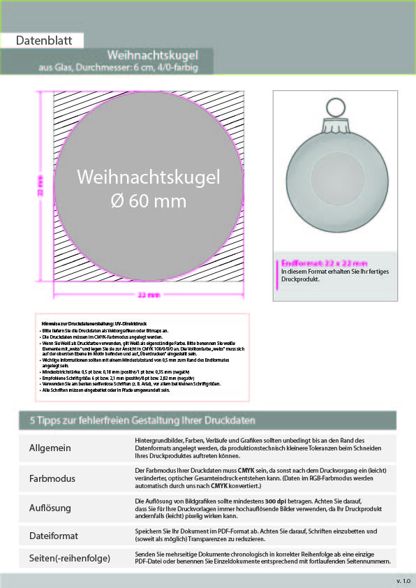 Weihnachtskugel aus Glas, Durchmesser: 6 cm, 4/0-farbig einseitig bedruckt