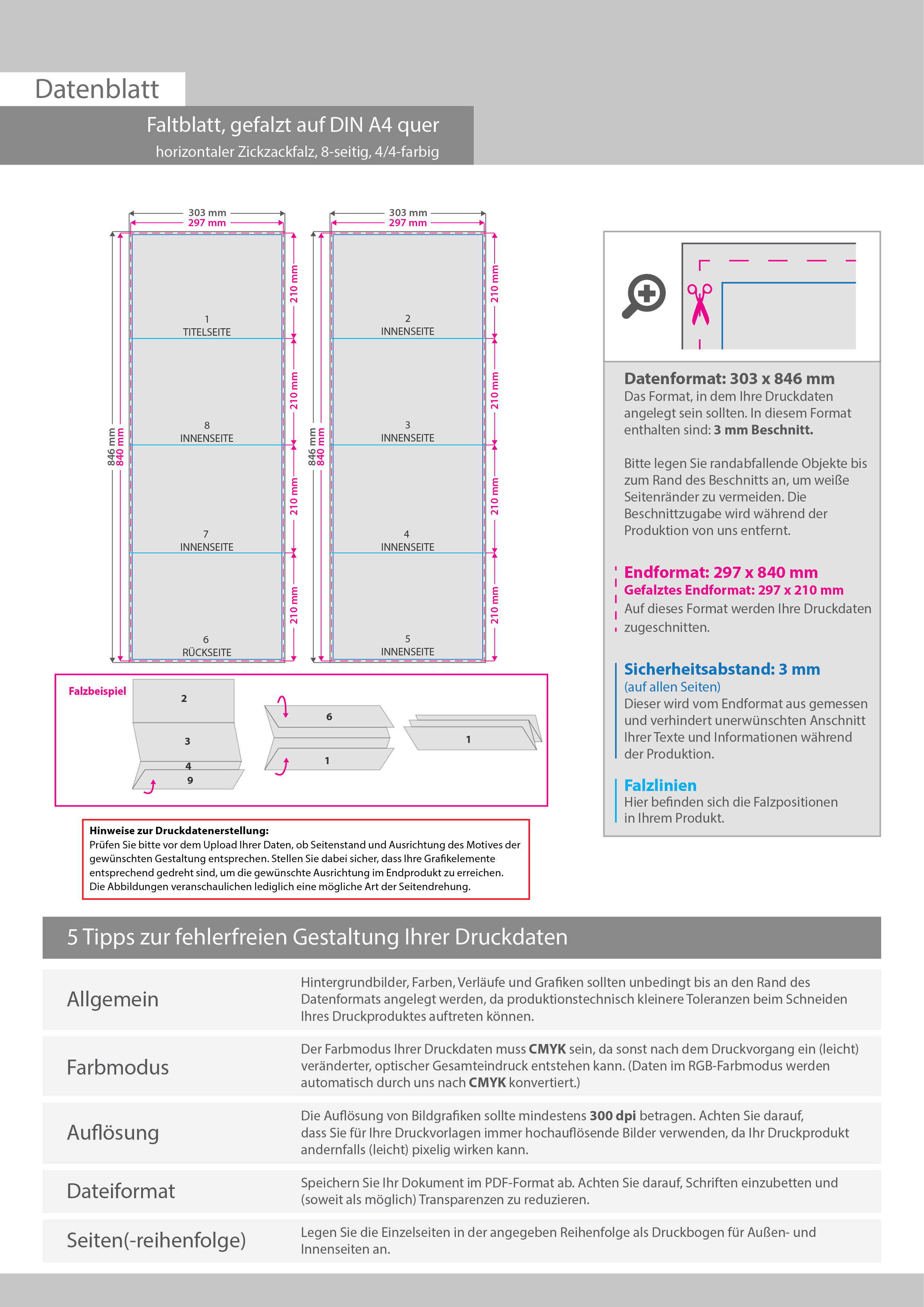 Faltblatt, gefalzt auf DIN A4 quer, horizontaler Zickzackfalz, 8-seitig
