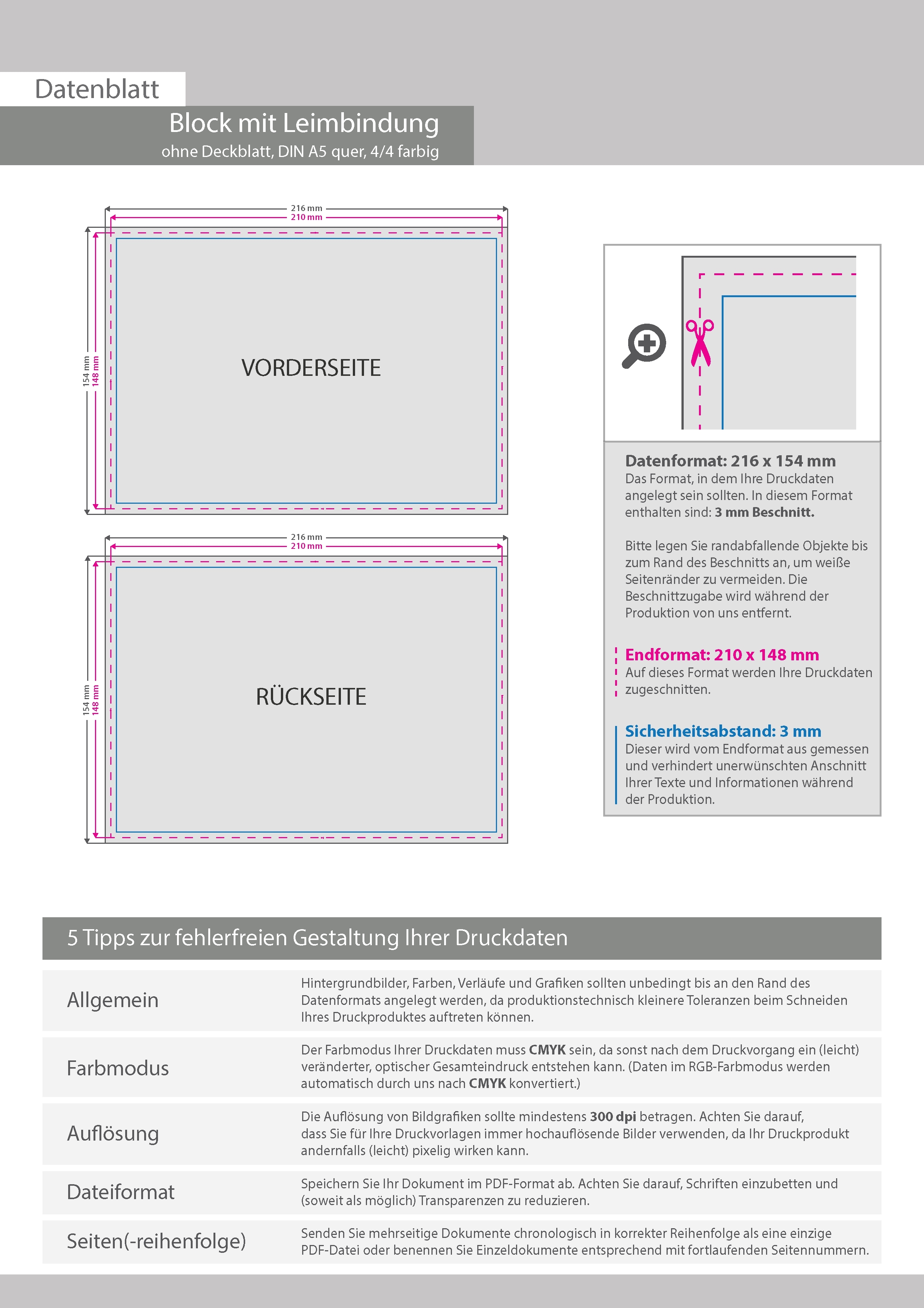 Block mit Leimbindung, DIN A5 quer, 200 Blatt, 4/4 farbig beidseitig bedruckt