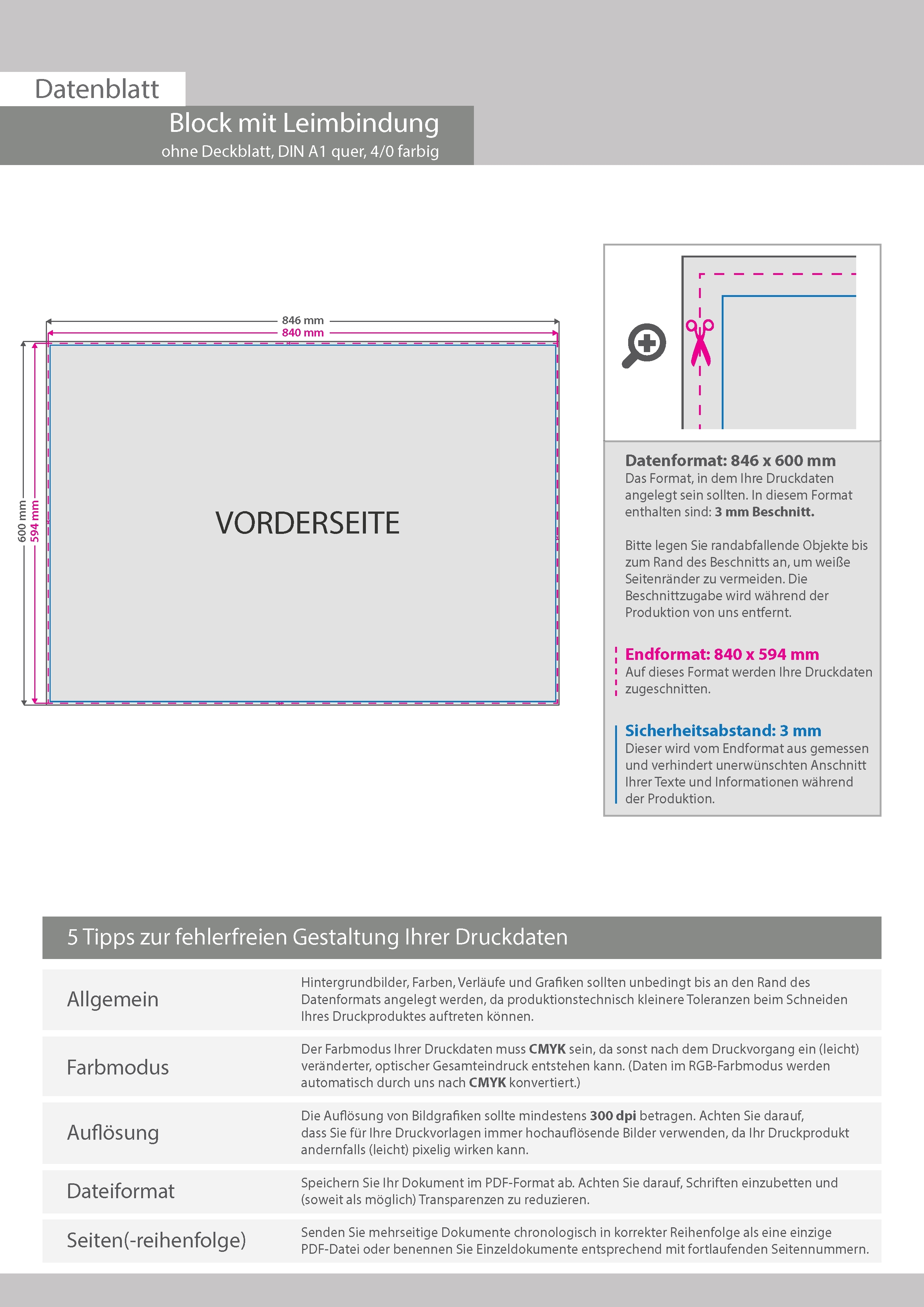 Block mit Leimbindung, DIN A1 quer, 100 Blatt, 4/0 farbig einseitig bedruckt