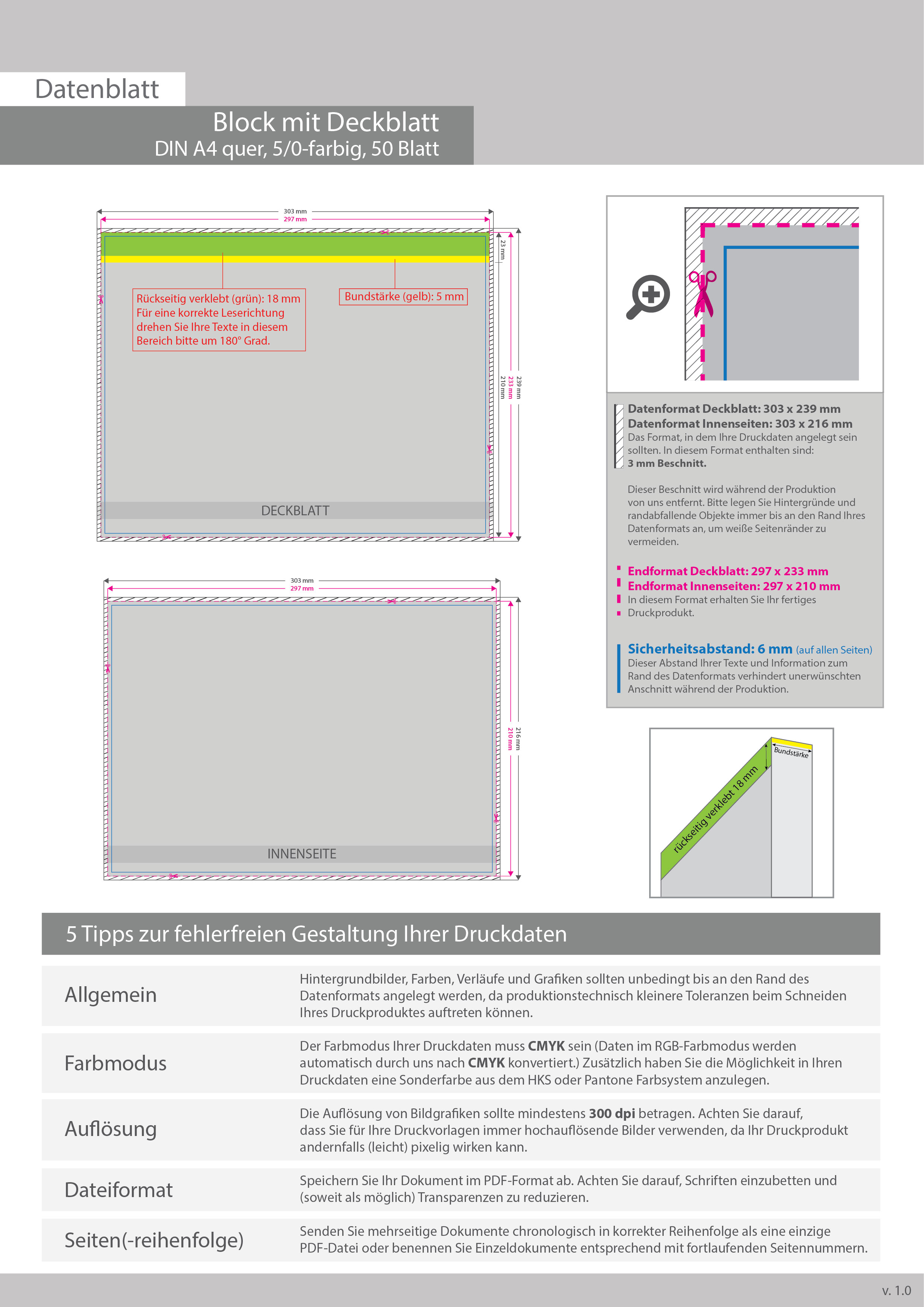Block mit Leimbindung und Deckblatt, DIN A4 quer, 50 Blatt, 5/0 farbig einseitig bedruckt (CMYK 4-farbig + 1 Sonderfarbe HKS oder Pantone)