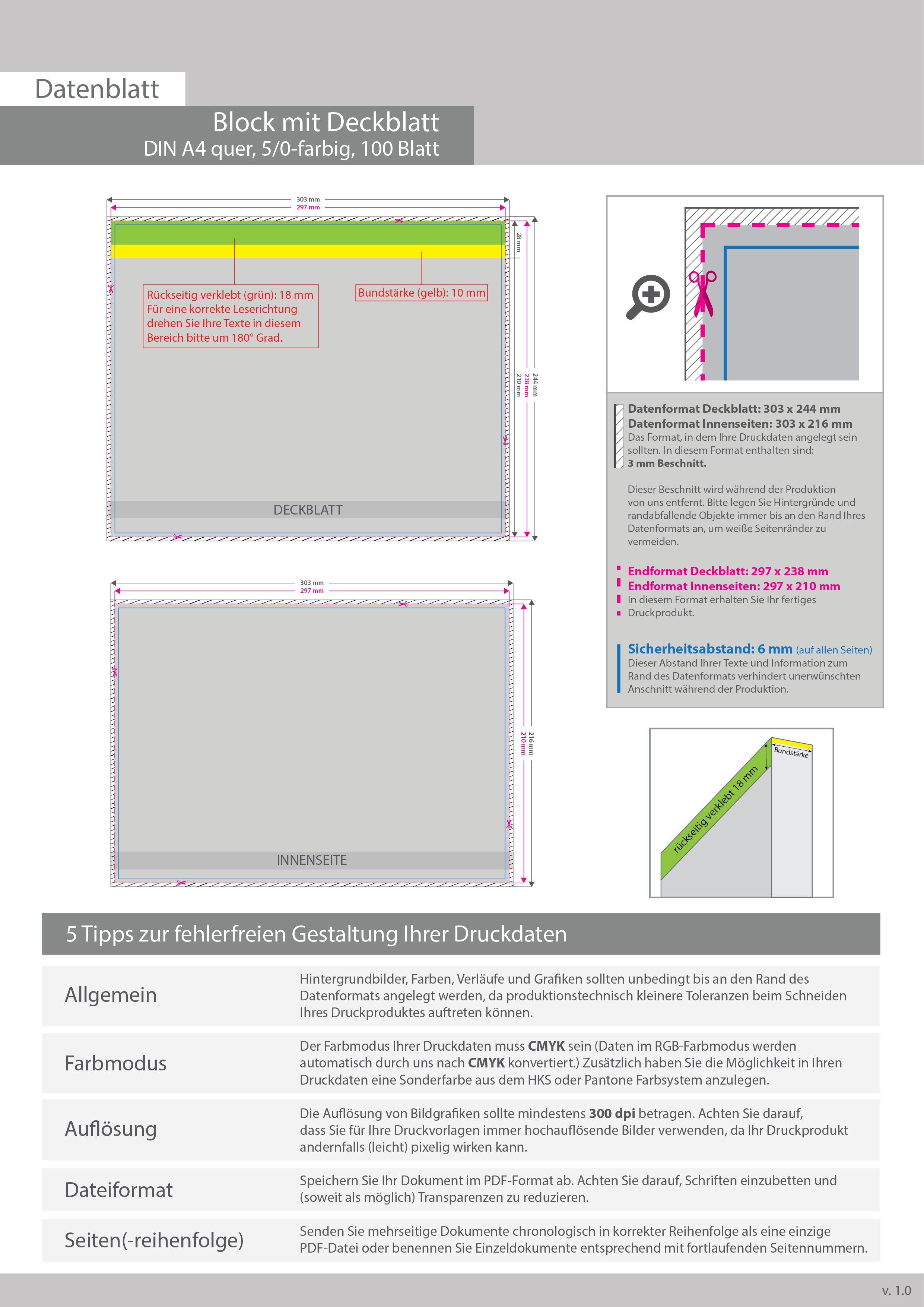Block mit Leimbindung und Deckblatt, DIN A4 quer, 100 Blatt, 5/0 farbig einseitig bedruckt (CMYK 4-farbig + 1 Sonderfarbe HKS oder Pantone)
