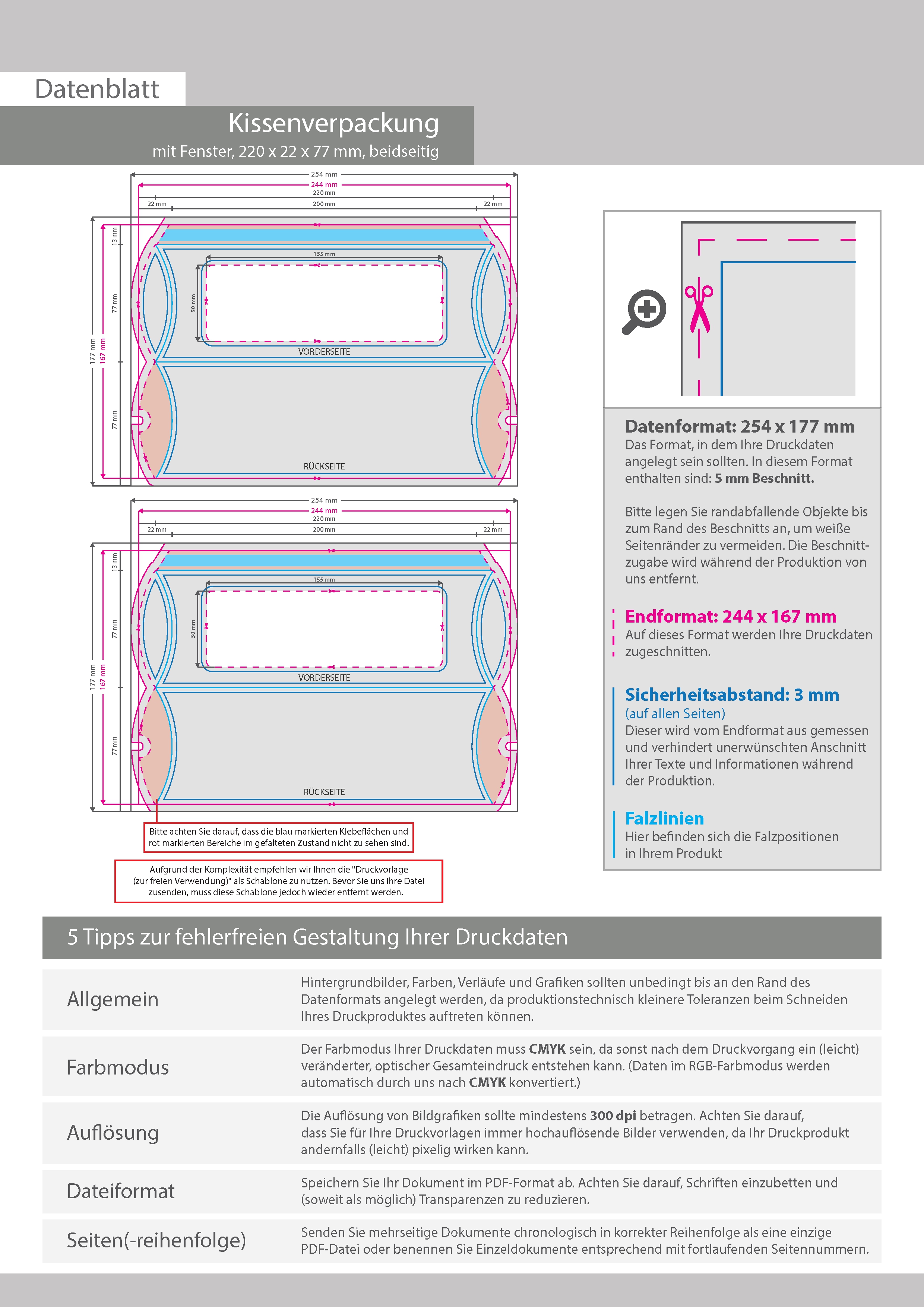 Kissenverpackung (22 cm x 2,2 cm x 7,7 cm) beidseitig bedruckt 5/4-farbig (CMYK + Sonderfarbe) mit gestanztem Fenster