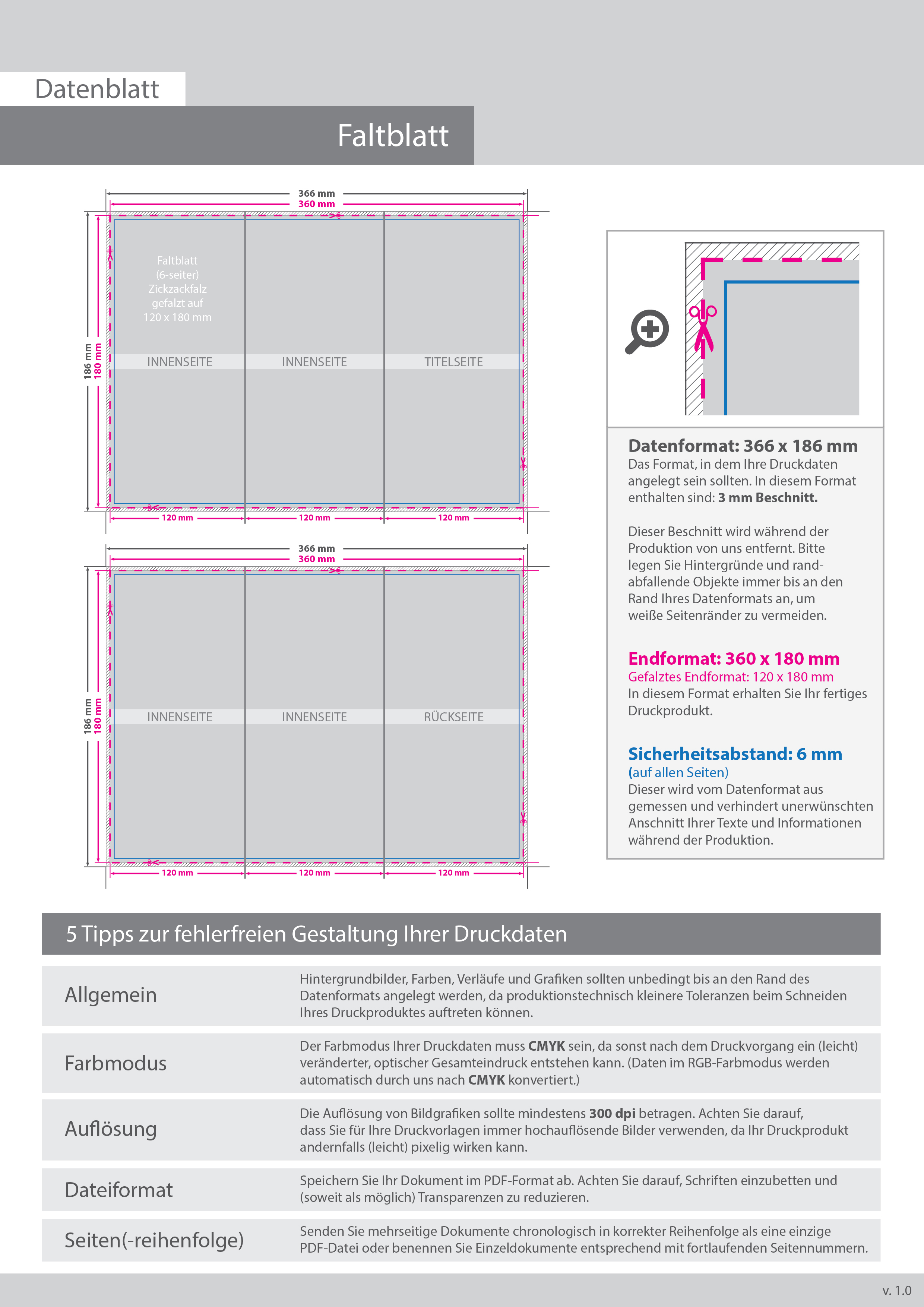 Faltblatt, gefalzt auf 12,0 cm x 18,0 cm, vertikaler Zickzackfalz, 6-seitig