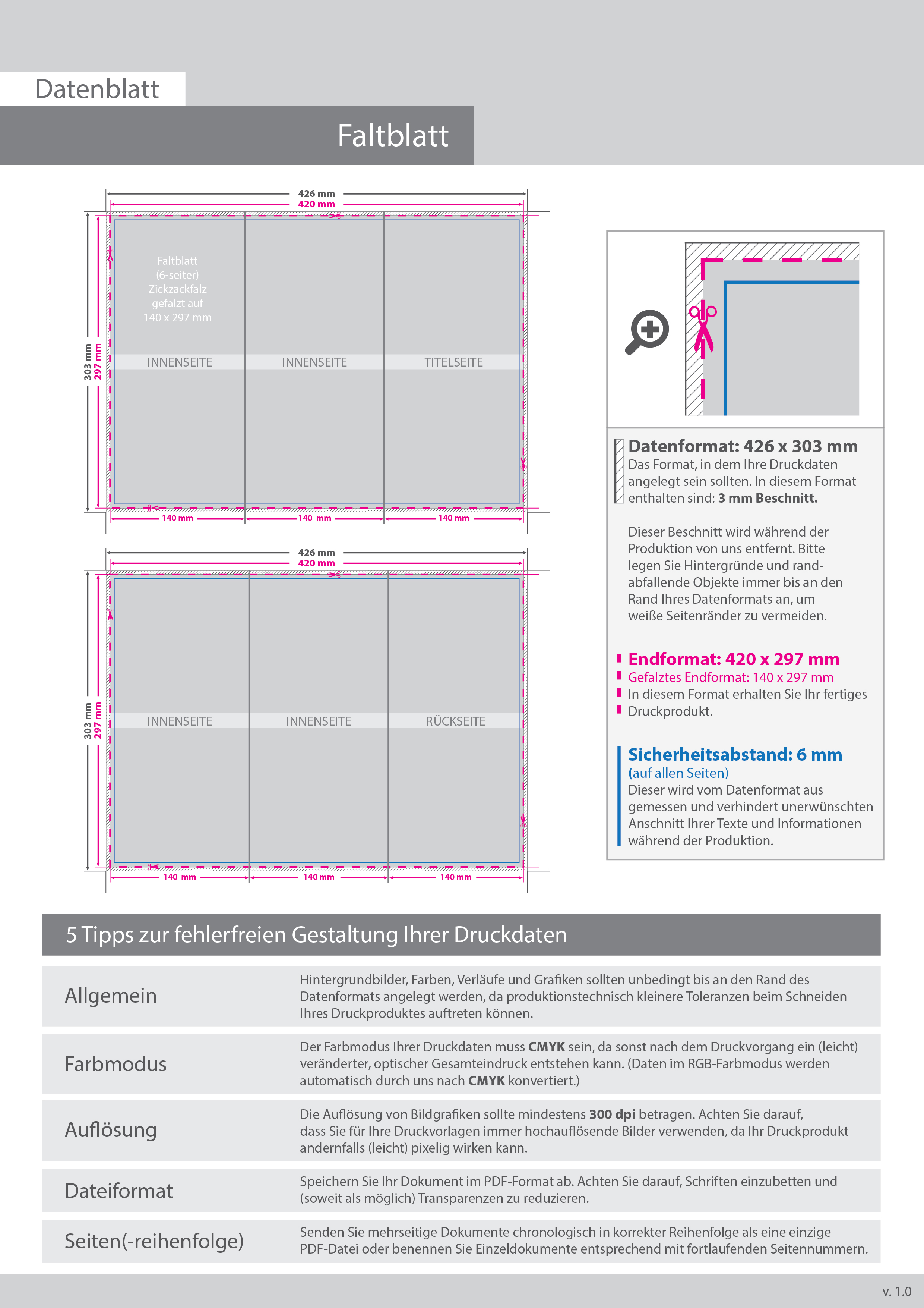 Faltblatt, gefalzt auf 14,0 cm x 29,7 cm, vertikaler Zickzackfalz, 6-seitig